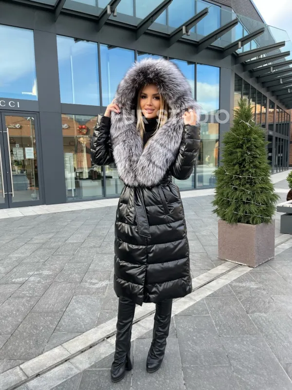Чёрное пуховое пальто с меховым капюшоном 100223