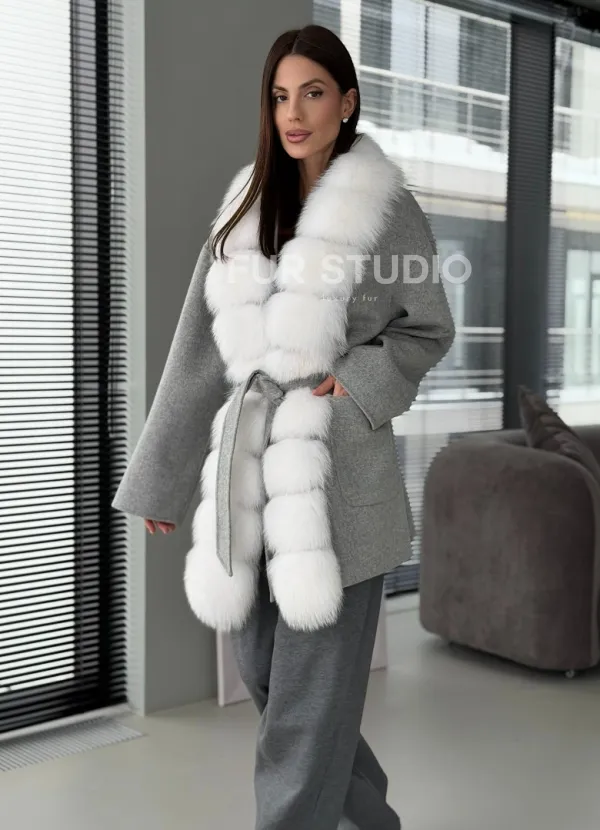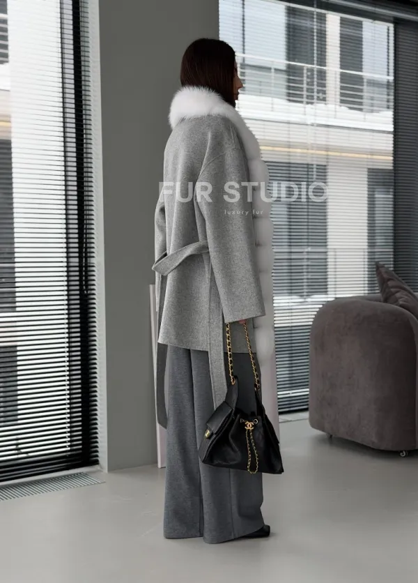 Серое пальто с меховым воротником 102909