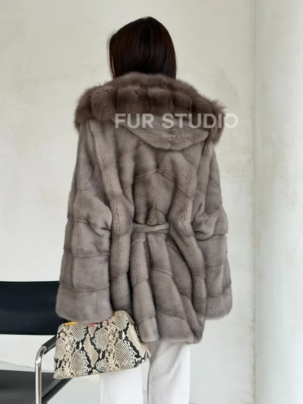 Серый норковый полушубок - капюшон куница 102553