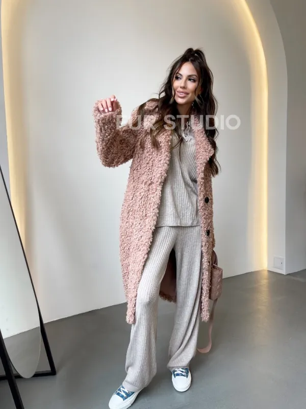Шуба из экомеха в цвете пудра 100098