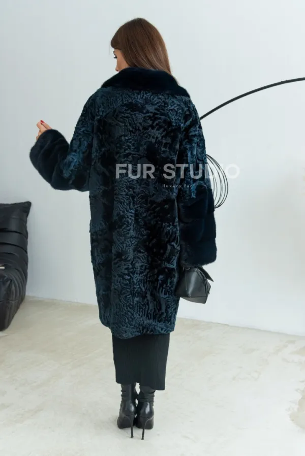 Шуба из каракульчи с английским воротником норки - цвет темно-синий 100188